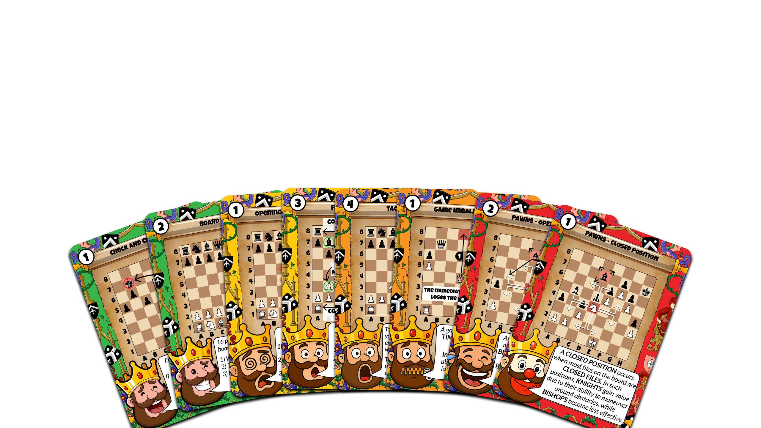 Chunky Chess is a set of premium flash cards that teach chess from beginner to intermediate — no board or pieces needed. With 70+ cards across four decks, players learn rules, tactics, strategy, and puzzles step by step. An expressive King guides the way, making learning clear, memorable, and fun.